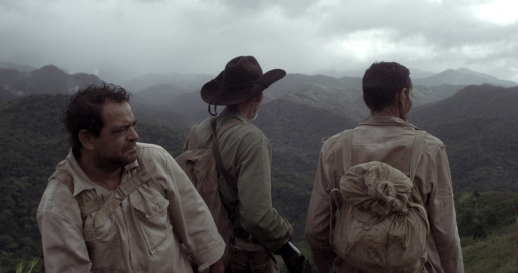 Drei Männer in Uniform, irgendwo im Urwald Kubas, simulieren einen Einsatz in Angola; kubanische Truppen unterstützten die MPLA, die Volksbewegung zur Befreiung Angolas, ab Mitte der 1970er Jahre bis in die späten 1980er Jahre. Die drei Veteranen trainieren Kampfabläufe mit der Machete oder schmieren sich zur Tarnung mit Erde ein, dann geht es weiter und weiter durch die dichte Fauna, ohne dass wir je genau wüssten, wohin und warum. Einen Auftrag haben sie, das wird gesagt, den Kampf müssen sie fortführen, Revolutionäre sein für immer, heißt es mehrmals. Einer der Männer beginnt, an der Sinnhaftigkeit des Ganzen zu zweifeln, einem anderen fault langsam das Bein ab, traumatische Erinnerungen werden geteilt. Entre perro y lobo erzählt von einem anhaltenden revolutionären Kampf, der keiner ist, von Männern, die immer weitermachen und nur sehr langsam an einen Punkt kommen, an dem sie ihr Tun in Frage stellen. Der Regen, Nebel und Tau, die Blätter, Gräser und Äste umgeben und verschlucken die drei, alle revolutionären Durchhalteparolen verhallen in der Gleichgültigkeit einer Natur, der die Frage nach dem Sinn fremd ist.