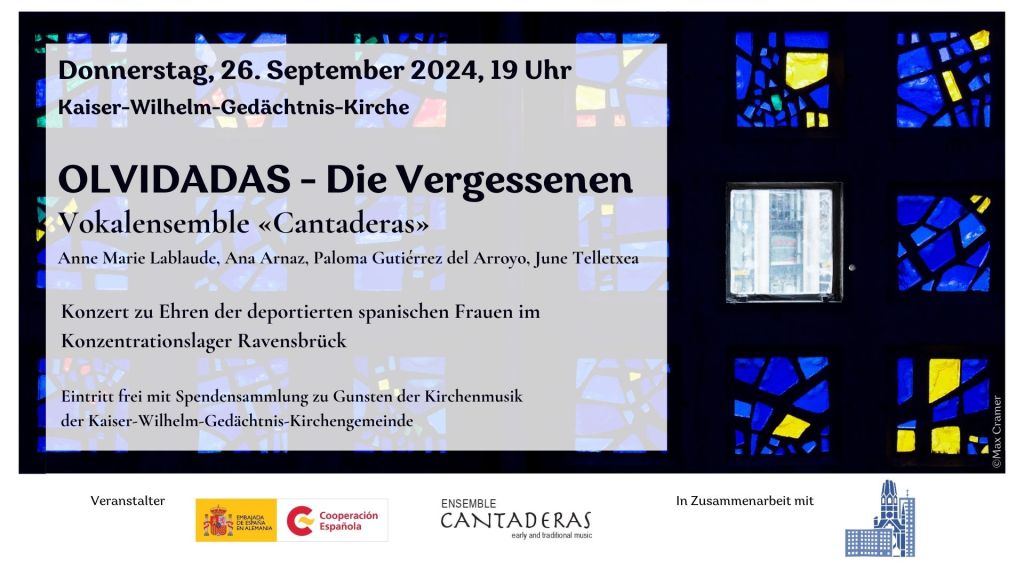 Die Botschaft von Spanien und die Kaiser-Wilhelm-Gedächtnis-Kirche Berlin laden Sie herzlich ein zum Konzert „OLVIDADAS – die Vergessenen“ zu Ehren der spanischen Frauen, die zwischen 1939 und 1945 in das Konzentrationslager Ravensbrück deportiert wurden.
